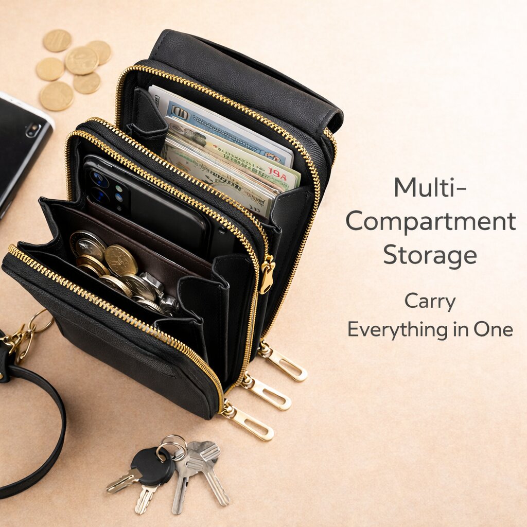 Multi-Compartment Storage: Stay organized with dedicated spaces for cash, coins, keys, and lipsticks. Includes three secure zipper sections for maximum safety.